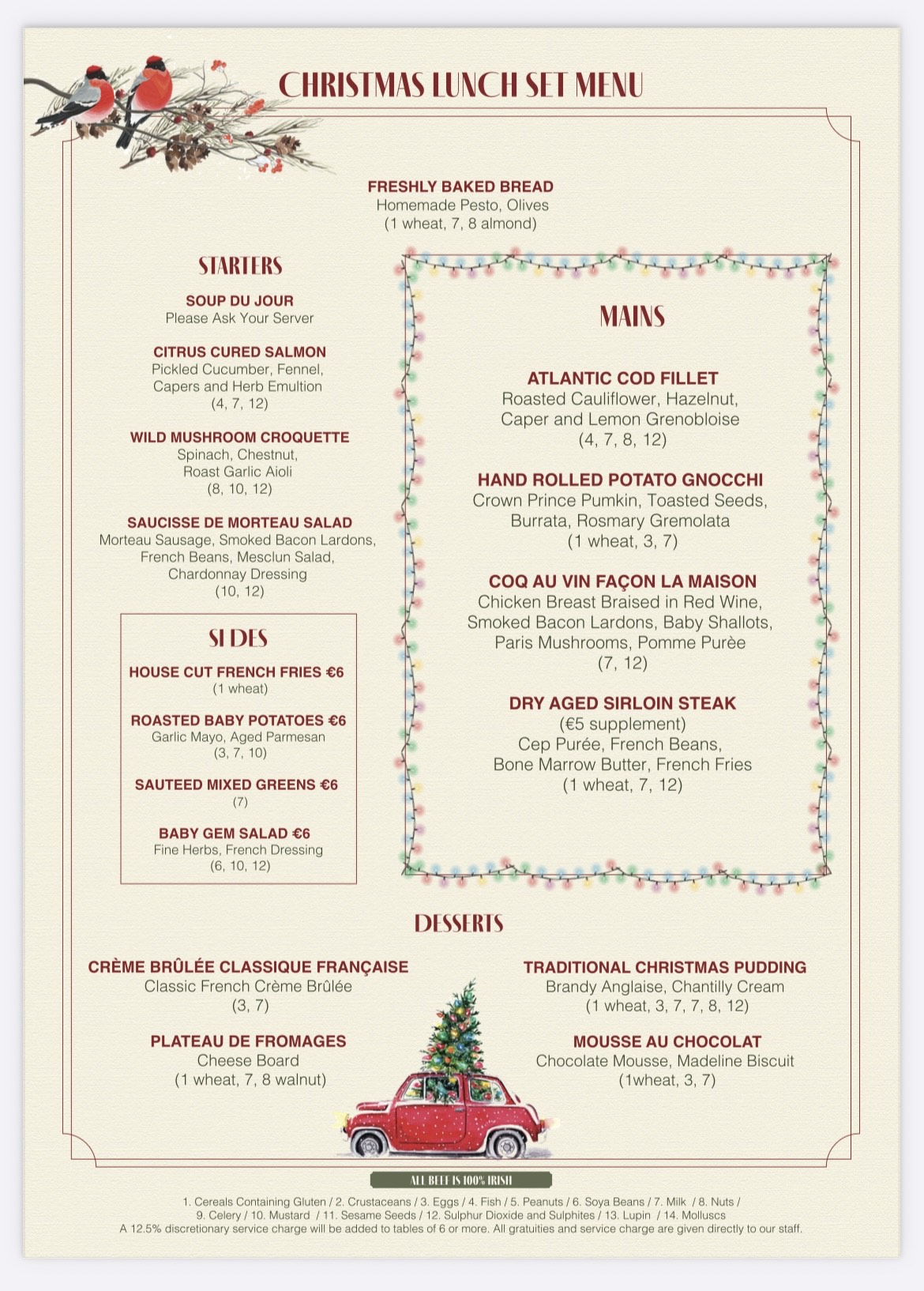 - Parties of six guests or more use the Set Lunch at €60 per person plus a service charge of 12.5 percent which goes directly to staff